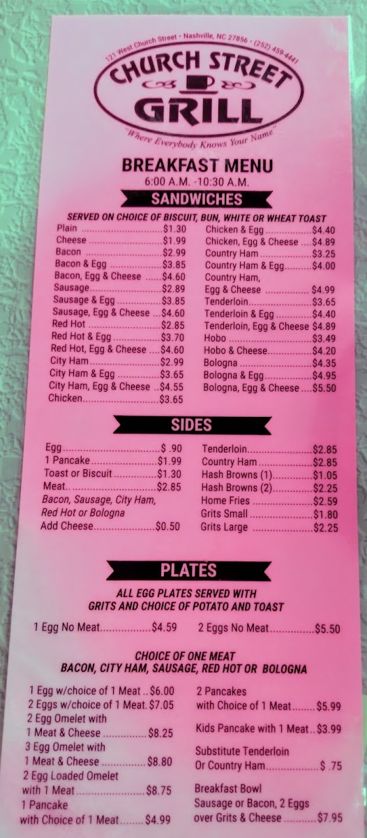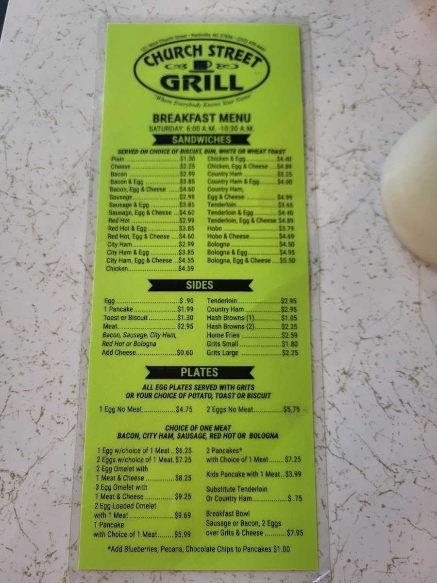 At Church Street Grill, located at 121 W Church St, Nashville, NC, the menu offers a diverse selection of classic comfort foods, perfect for breakfast or a satisfying meal throughout the day. The Sandwiches section presents a variety of options, from the simple yet delicious Plain sandwich, to the indulgent Bacon & Egg and Bacon, Egg & Cheese sandwiches, offering a great balance of flavors for any preference.