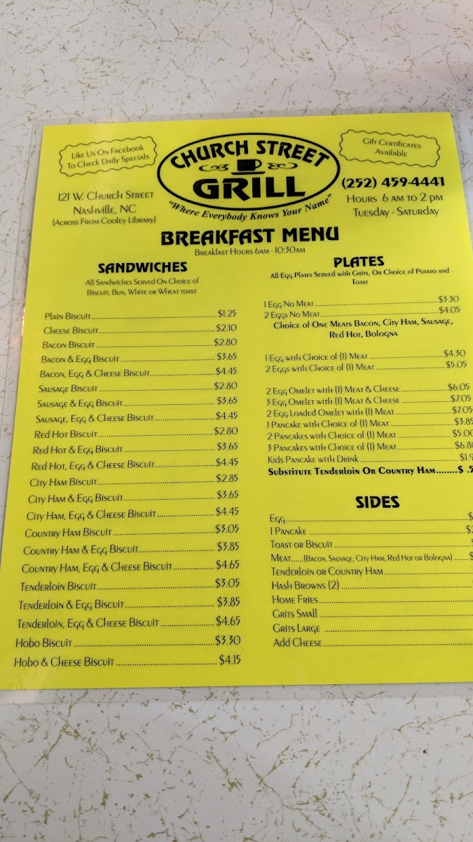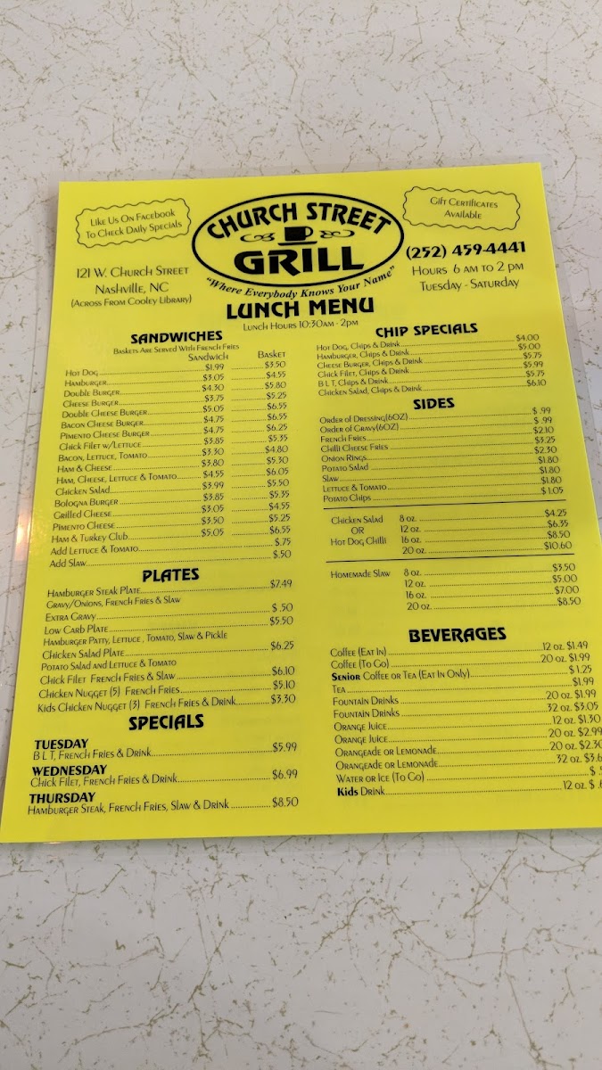 With its affordable options and wide range of comforting dishes, Church Street Grill’s menu offers something for everyone, whether you're in the mood for a quick snack or a full meal. The prices are reasonable, and the flavors are comforting, making it an ideal spot for a casual and satisfying dining experience.